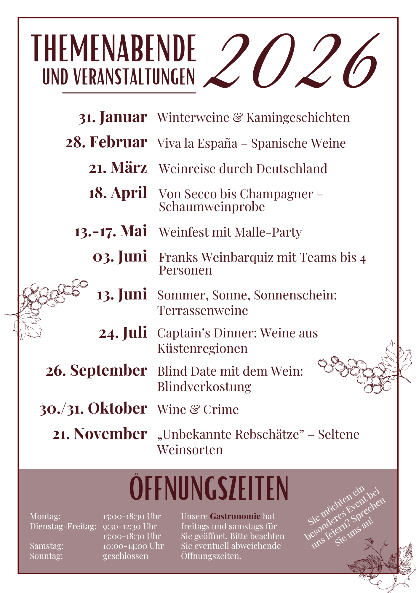 Für die Themenabende haben wir immer 30 Plätze. Sichert euch eure Tickets für euer Lieblingsthema am besten direkt in der Vinothek. Beim Ticketkauf könnt ihr die Gruppengröße angeben, damit ihr mit eurer Familie, euren Freund*innen, Bekannten oder Arbeitskolleg*innen auch zusammen sitzt.